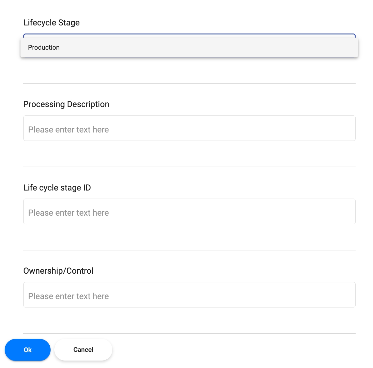 Once the product has been defined, you'll need to define the life cycle stage. Click on the "life cycle stage" button and fill out the life cycle stage form.