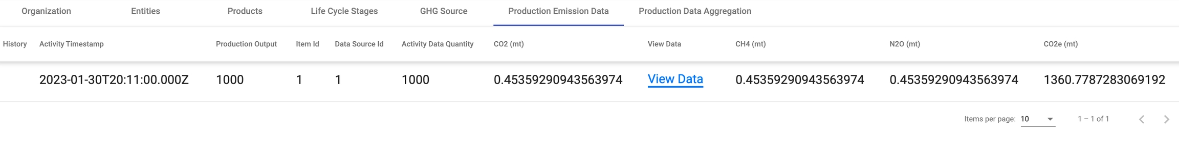 You can select the "Production Emission Data" tab to view the emissions from the product we just created.