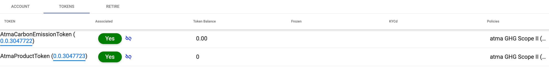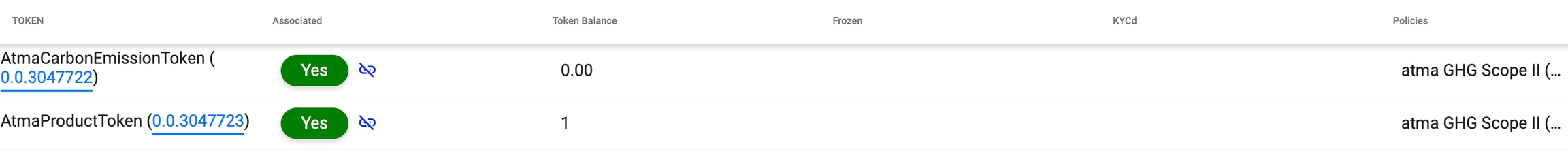 The atma GHG policy issues an NFT token (AtmaProductToken) for every product that has been defined. Once the product has been defined, you can go out of the Policy screen and click over to the Profile screen. There you can click on the "Tokens" tab and notice that the token balance has been increased.