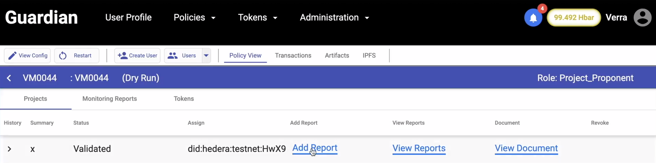 13. Once validated, we login as Project Proponent and Add Monitoring Report.