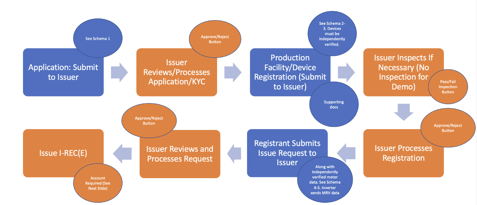 The workflow begins with the Registrant, generally the owner of an energy production facility or a party acting on their behalf, submitting an application to the Issuer for approval. Once approved, the Registrant submits a registration request to the Issuer for the facility/device that will be providing the MRV data. This will include both general information, as well as attributes (e.g., energy sources, location, etc.). Note that devices must be, and often are already, independently verified. Under certain circumstances, an inspection may be necessary. Once the Issuer processes and approves the facility/device registration, an issue request can be sent to the Issuer along with independently verified meter data. After the Issuer approves the issue request, I-REC(E) certificates are issued