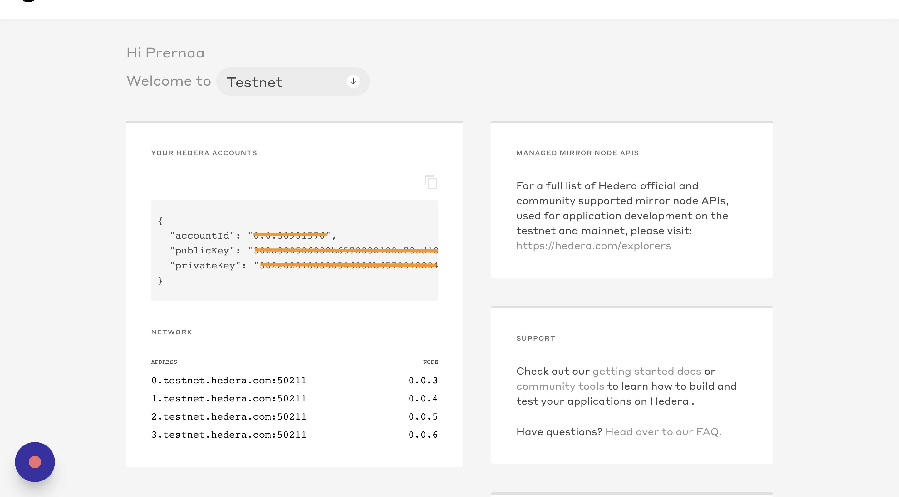 2\. Once logged in successfully, we will get account ID, Private Key and Public Key of Hedera Testnet.